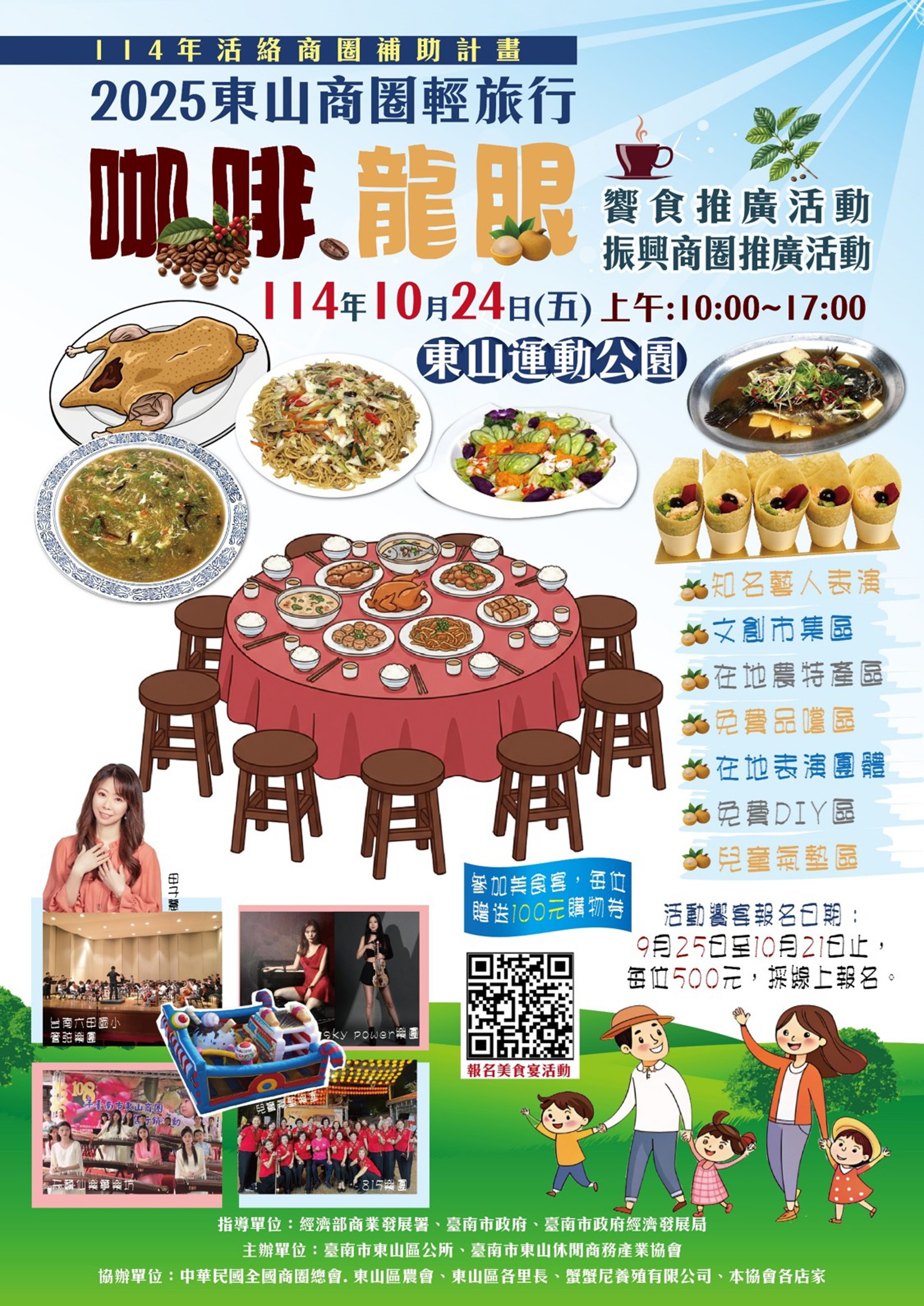 活動周邊設置了多樣化的區域,包括文創市集區、農特產市集區、兒童遊戲氣墊區,以及咖啡品嘗體驗等,適合全家大小共同參與。凡報名參加美食饗宴的民眾,每人需支付500元線上報名費,現場還可獲贈100元購物券,讓大家盡情享受東山的魅力與風味。