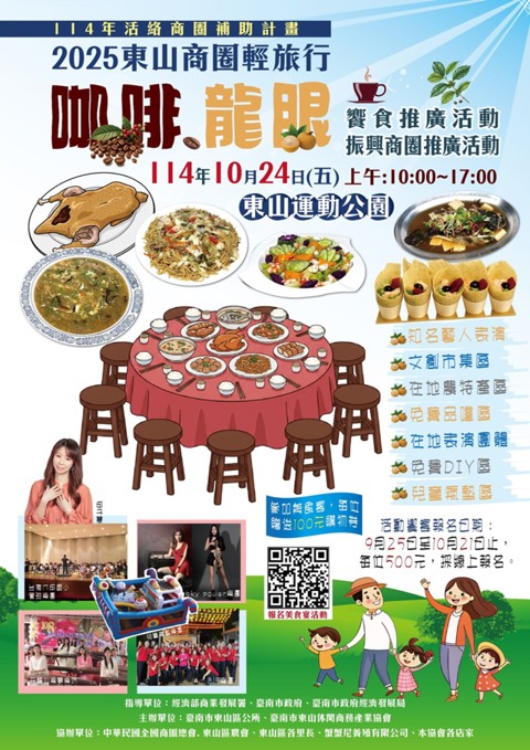 今年特別推出「咖啡龍眼饗食振興商圈推廣活動」,首次舉辦特色商品饗宴辦桌,以東山當地的農特產為主題,並以咖啡與龍眼作為推廣的核心亮點。活動最主要讓全台民眾更加了解臺南東山的地方特色與文化。