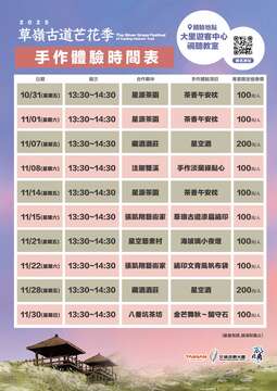 辦理時間:芒花季期間每週六日約為 09:00~15:00,詳細時間請洽大里天公廟03-9781075