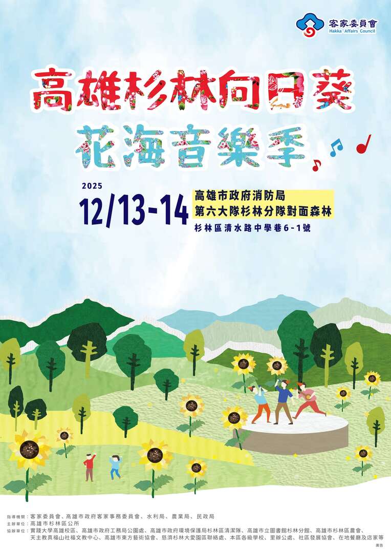 指導機關:客家委員會、高雄市政府客家事務委員會、水利局、農業局、民政局|協辦單位:實踐大學高雄校區、高雄市政府工務局公園處、高雄市政府環境保護局杉林區清潔隊、高雄市立圖書館杉林分館、高雄市杉林區農會、天主教真福山社福文教中心、高雄市東方藝術協會、慈濟杉林大愛園區聯絡處、本區各級學校、里辦公處、社區發展協會、在地餐廳及店家等