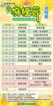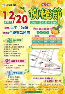 ● 好看好聽|藝文表演 社區鼓陣隊-鼓陣表演 社區媽媽土風舞班-舞蹈表演 中寮國小-打擊樂表演 廣福國小-口琴表演 中寮國中-烏克麗麗表演 電動鑼LINE吧樂團表演 ● 在地工藝|限額免費體驗 旺旺來手作 漆扇DIY 數量有限!發完為止 !! ● 限量名額|免費品嚐 中寮在地農產品 特色美食品嚐 數量有限!發完為止 !! 在地農特產品消費滿200元,可獲得摸彩券1張!