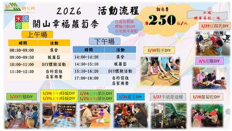 活動內容:蘿蔔田拔蘿蔔、各式體驗活動、美味的風味餐(到店家用餐)。