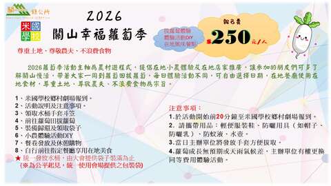 2026蘿蔔季活動主軸為農村遊程式,提倡在地小農體驗及在地店家推廣,讓參加的朋友們可多了解關山慢活,帶著大家一同到蘿蔔田拔蘿蔔,每日體驗活動不同,可自由選擇日期,在地餐廳使用在地食材,尊重土地、尊敬農夫、不浪費食物為宗旨。
