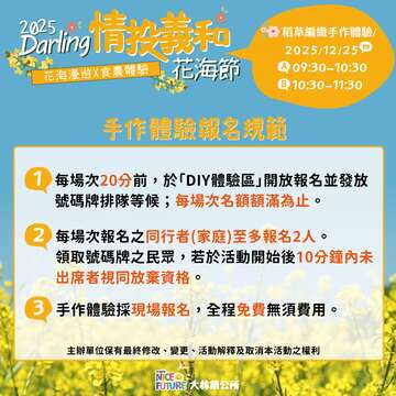 手作體驗:DIY 稻草編織體驗,親手感受農村工藝(名額有限,20分鐘前現場報名喔!)。