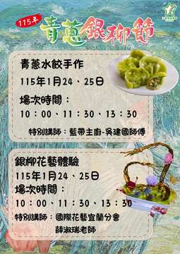 銀柳花藝: 邀請花藝協會老師,運用當季盛產的銀柳,教您親手製作獨一無二的創意盆栽。銀柳諧音「銀兩」,象徵著「銀子留在家裡」,讓您新年財源廣進!