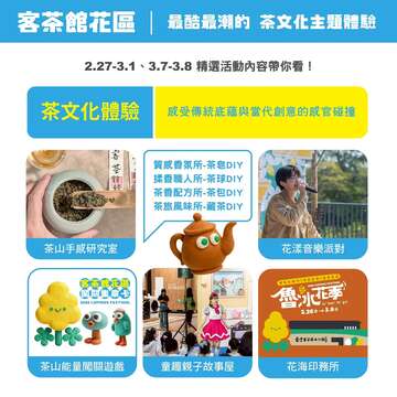 以茶為核心,結合親子故事屋、手作體驗、豐富展覽內容與音樂展演,帶你看見傳統與當代交會的客家茶文化魅力。
