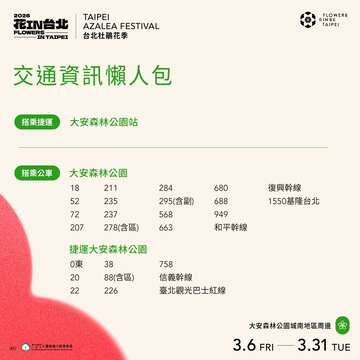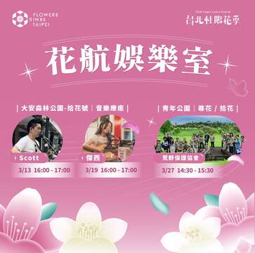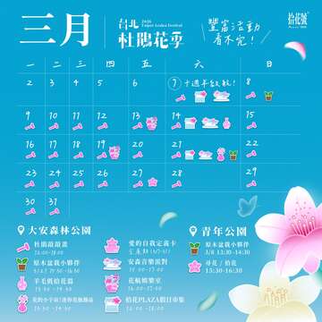 台北市市花「杜鵑花」,為城市點綴上春季浪漫的粉嫩色彩。以大安森林公園為活動展場,結合城南地區周邊商圈,舉辦各式音樂表演、手作課程等。適合闔家出遊的「台北花伴野餐」活動,邀請大家前來賞花!
