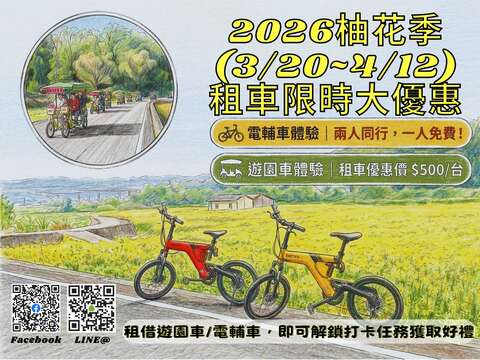 • 活動主旨:春暖花開,西湖鄉的柚花香氣已經撲鼻而來! 邀請大家在柚花盛開的季節,來到湖東休閒農業區,感受漫步或騎乘在柚子山的浪漫。不論是家庭出遊或情侶約會,都能在這裡被陣陣清香治癒,帶回滿滿的芬芳回憶。現在來西湖遊玩還有租車優惠!