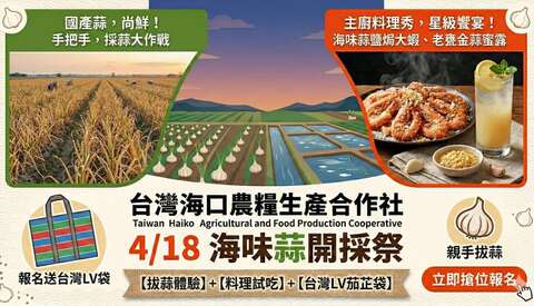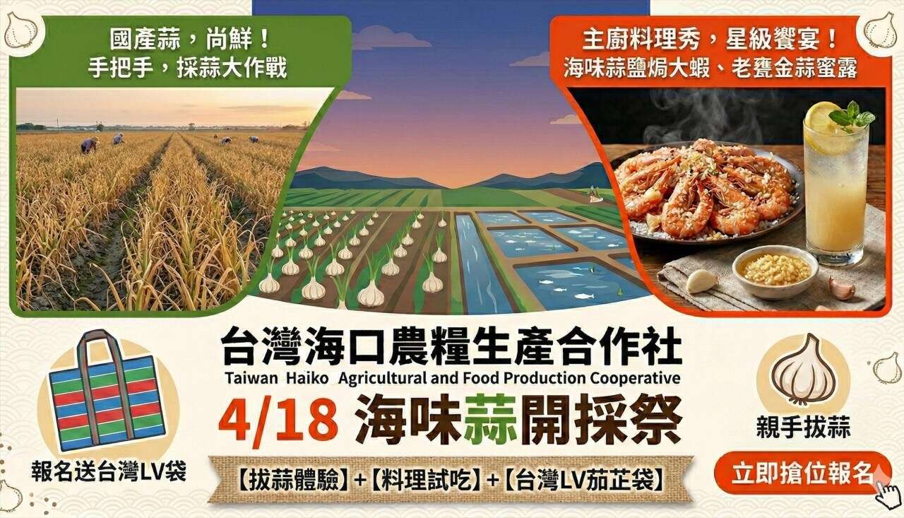 4 月 18 日邀您走入蒜田,親手開採正港台灣蒜,品嚐星級主廚的舌尖饗宴,現場還有剪蒜職人實境剪蒜頭!