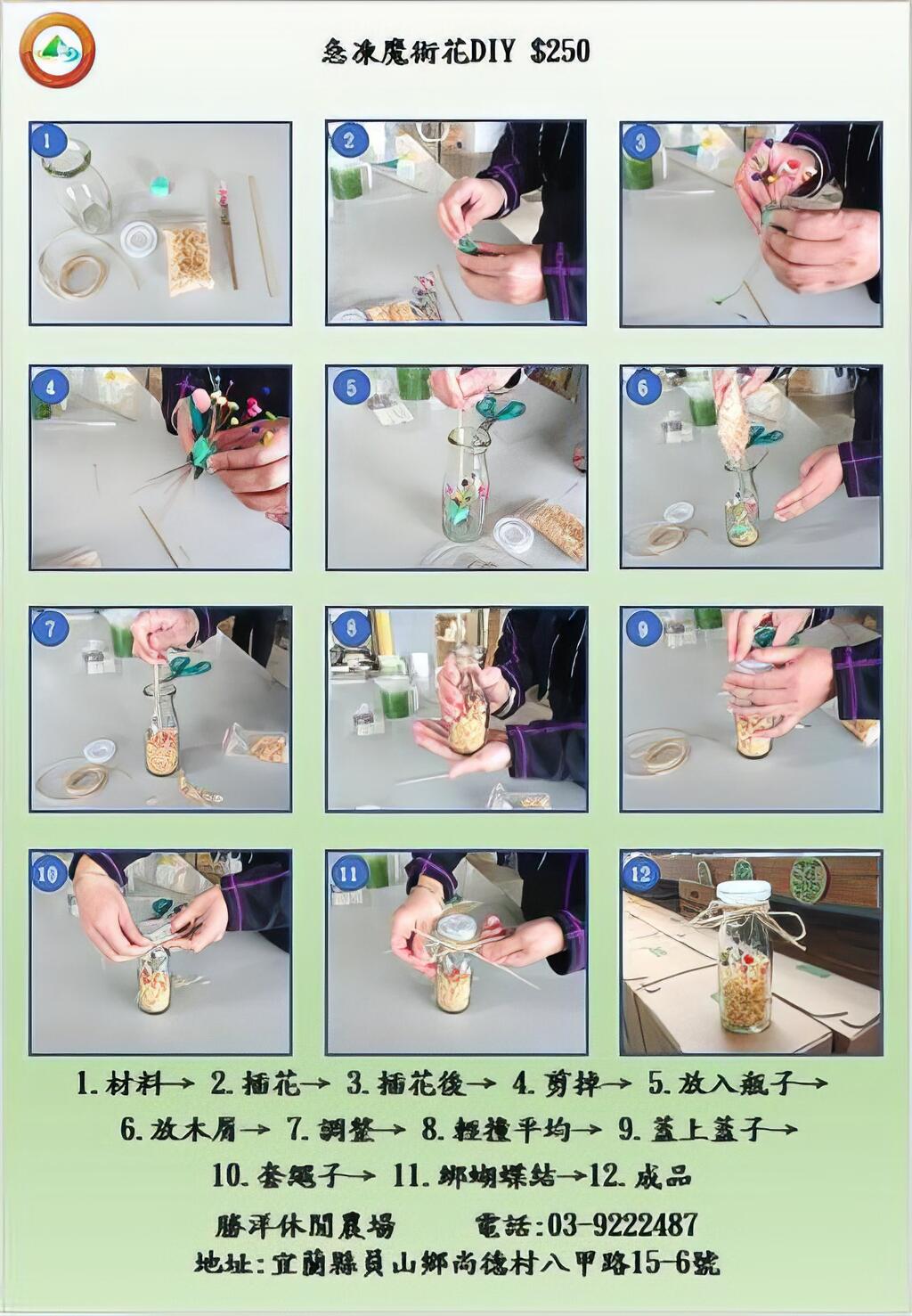 1.材料→ 2.插花→ 3.插花後→ 4.剪掉→ 5.放入瓶子→ 6.放木屑→ 7.調整→ 8.輕撞平均→ 9.蓋上蓋子→ 10.套繩子→ 11.綁蝴蝶結→12.成品