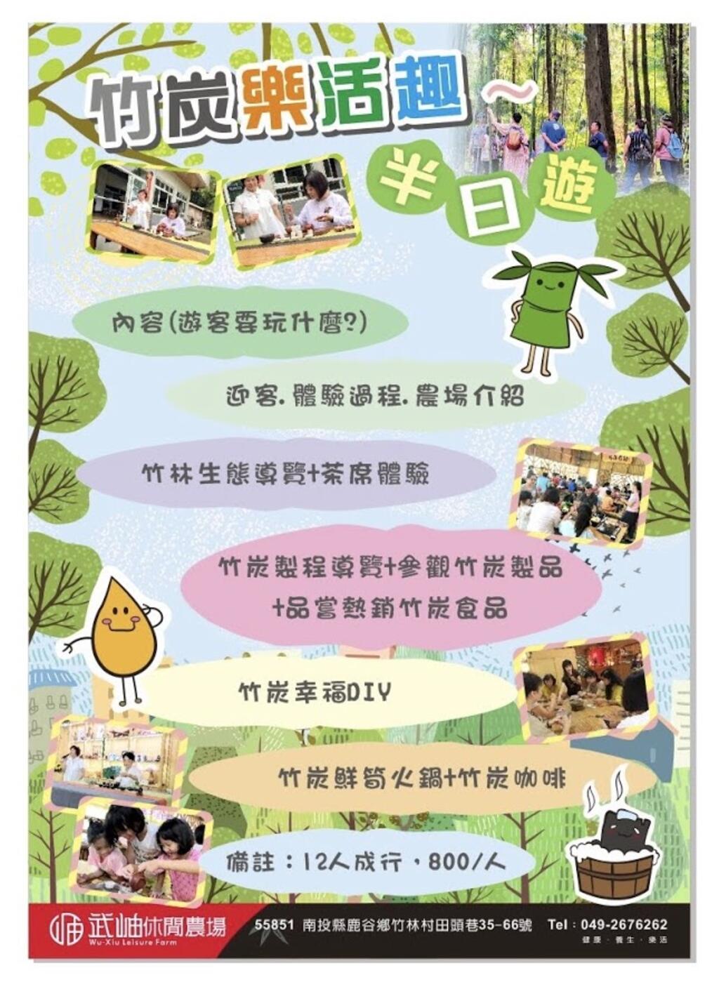 遊程內容:迎賓樂→竹林生態導覽→茶席品茗→竹炭製程導覽→參觀竹 炭製品→品嘗熱銷竹炭食品→ 竹炭飾品DIY→竹炭鮮筍小火鍋
