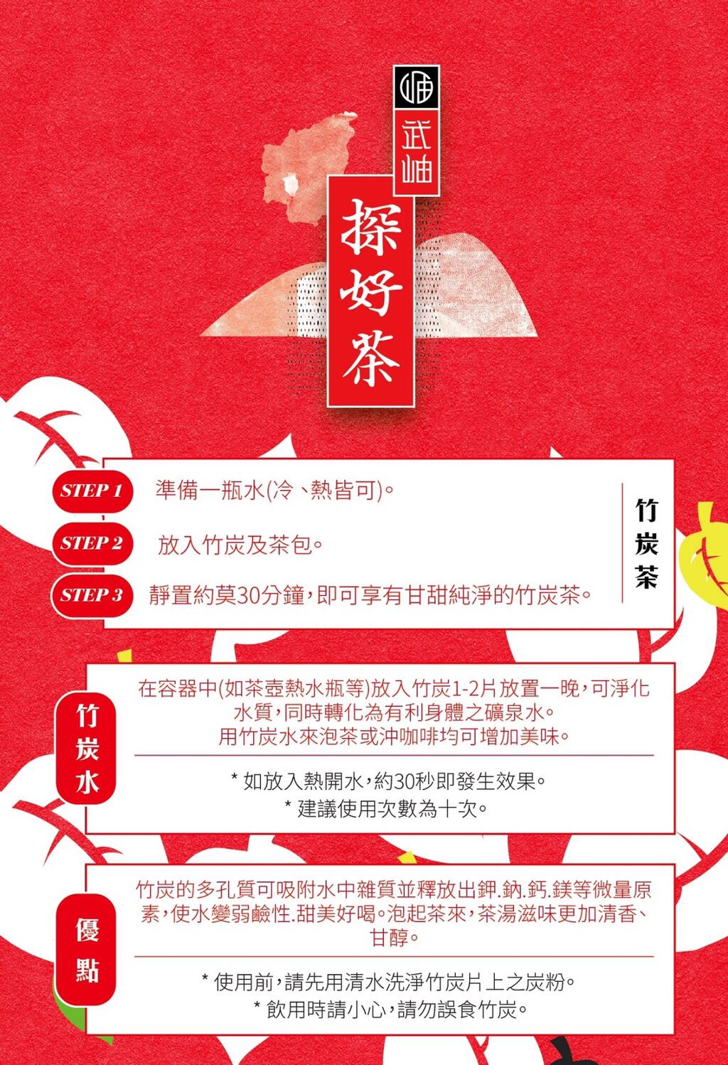 「武岫孟宗竹炭」燒製係以四年生以上的孟宗竹為材料,採用高溫炭化技術,歷時十多天,以傳統窯手工精心燒製而成(並非一般機械燒材油方式)。