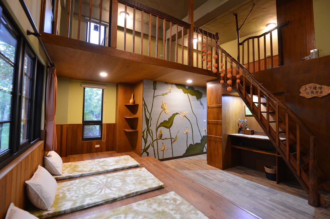 女主人一荷手作染布、彩繪壁畫、室內裝潢、裝置藝術佈置,二人同心,共創藝術美感民宿家園。單斜挑高的【綠建築】,整體呈現 簡樸、自然、寧靜、優雅,既古典又現代的氛圍,日式中庭花園的設計,有利採光通風,減少能源消耗;開設高低窗,以熱對流降低室內溫度;屋頂鋪設太陽能板,運用太陽能提供熱水系統及發電功能,獲得高綠能產值,並降低屋頂熱傳導之雙重效益。減少使用高排碳量之建材,裝修結構輕量化,以達到外殼節能、自然照明、淨化室內空氣品質的目標。