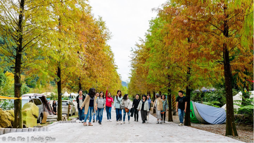 風梨屋佔地面積寬廣, 有全長一公里的落雨松大道, 園區內有大大小小流水瀑布以及精彩的拍照景點,擁有豐富的水資源及自然生態, 晚上可以倘洋在浪漫星空的懷抱裡, 享受蟲鳴鳥叫。(落雨松大道示意圖)