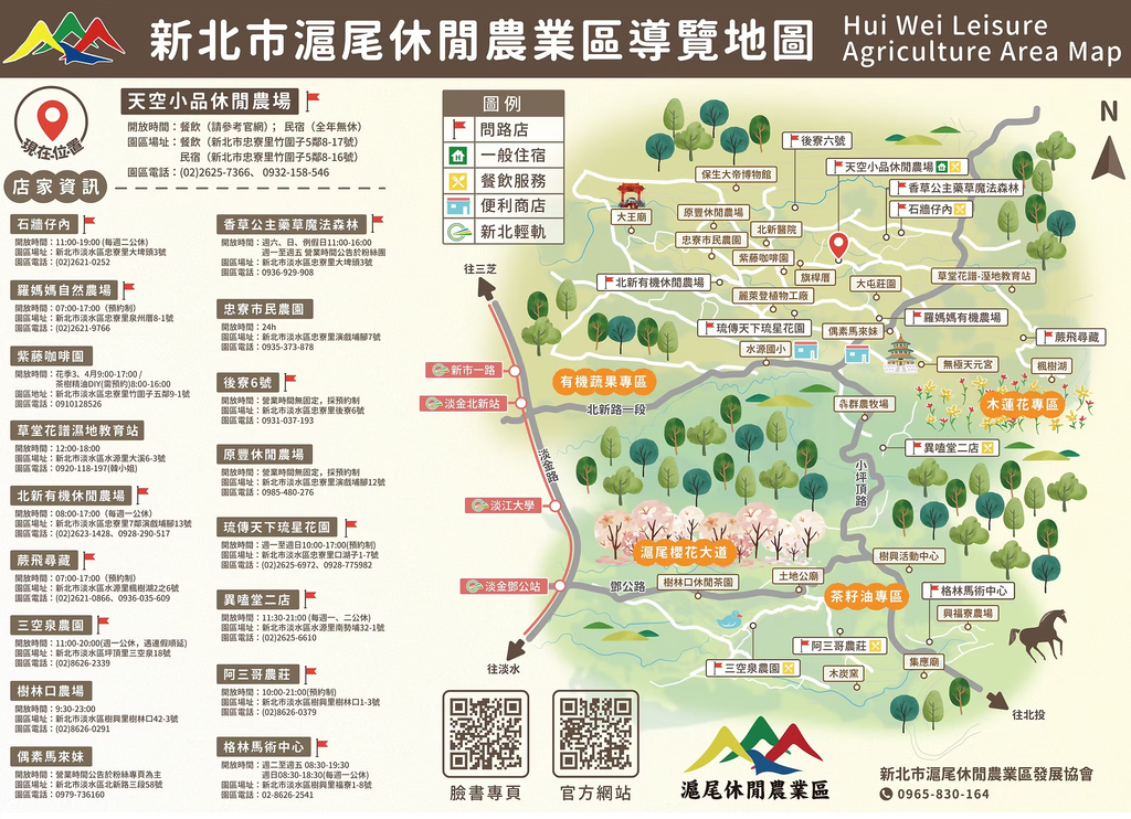 農場:北新有機休閒農場、琉傳天下觀光工廠、石牆仔內、羅媽媽自然農場、草堂花譜濕地教育站、後寮6號、原豐休閒農場、天空小品休閒農場、阿三哥農莊、三空泉農園、忠寮市民農園。