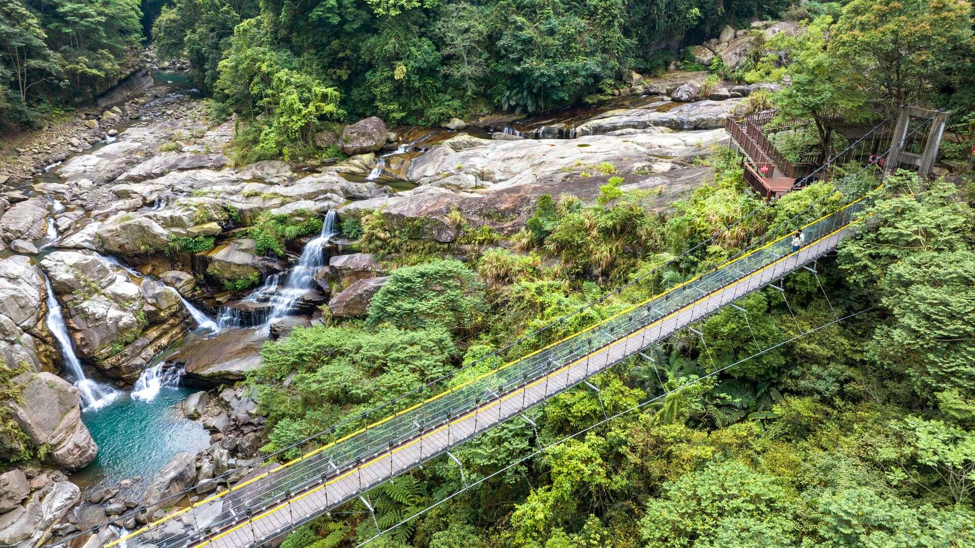 神仙谷的溪谷由6、7層的岩階組成,當溪水層層傾瀉而下時形成氣勢磅礡的水瀑,景色非常的壯觀。總長150尺的吊橋連接到對岸的石門步道,適合喜歡健行的遊客。