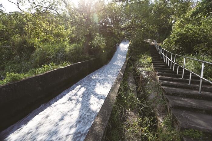 水聲轟轟,如萬馬奔騰,氣勢磅礡,這是水沖呇/水溜龍的景象。在日據時期所建造灌溉用水圳,沿著虎角山腰向東奔流,灌溉整外埔農業區,在水圳分流處設置引流水閘門,輪水番時打開水閘門,水由高處直瀉而下,衝擊力大遇到坡崁,瞬間濺起水花,帶有水霧飛散四處,清涼有勁,場面壯觀令人驚嘆,蔚為觀止,想目睹此景也只能在灌溉期才能遇見。