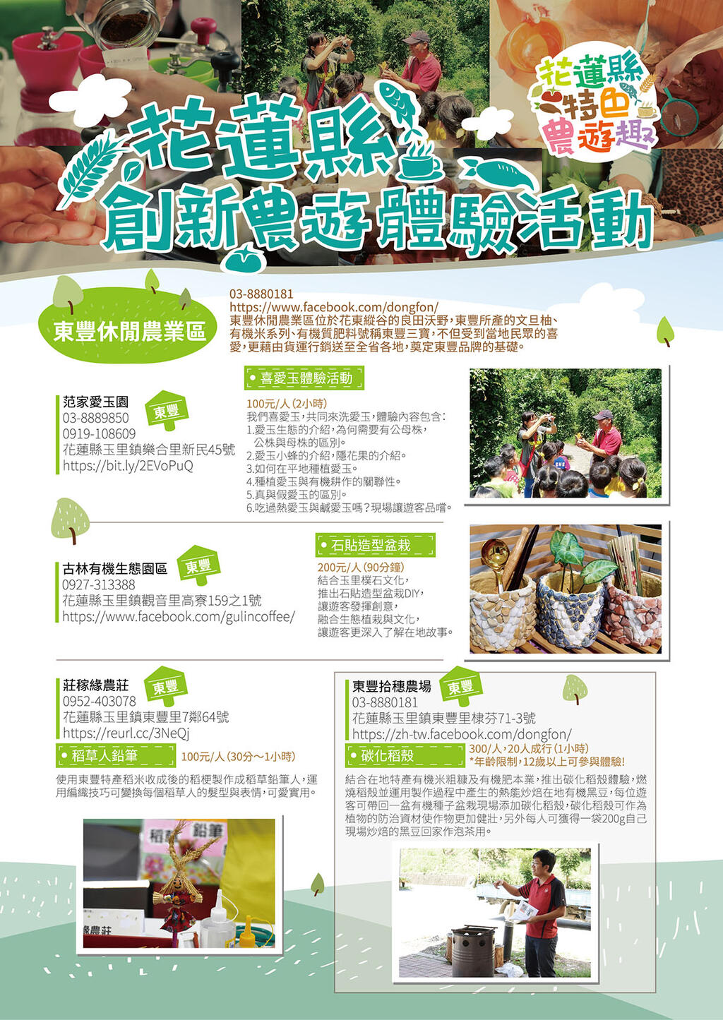 東豐社區位於花蓮縣玉里鎮東南側太古嶺下,西臨秀姑巒溪、地形呈狹長型的平原,以有機米及東豐文旦聞名,是花蓮最早的休閒農業區,保有自然純樸的農村風貌,是具有重要生態棲地以及多元豐富族群文化資源的重要地區。東豐休閒農業區位於花東縱谷的良田沃野,東豐所產的文旦柚、有機米系列、有機質肥料號稱東豐三寶,不但受到當地民眾的喜愛,更藉由貨運行銷送至全國各地,奠定東豐品牌的基礎。