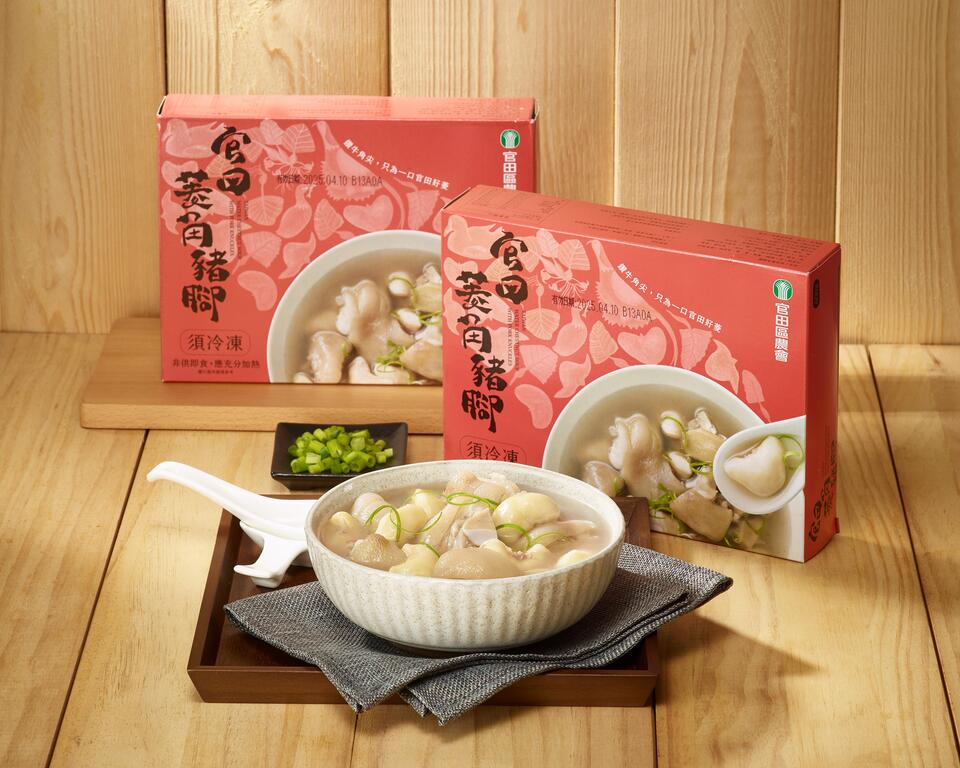本會所生產之菱角仁,乃由產銷履歷班員供應,使用台灣國產畜產品豬腳,用傳統烹調方法,符合媽媽的味道。嚴選官田特優菱角與肉質豐潤的豬腳相融合,散發誘人的香氣,湯頭帶有淡淡的菱角清香,提供豐富的營養價值。這道美食既能滿足味蕾的享受,也能為身體帶來營養的補充。