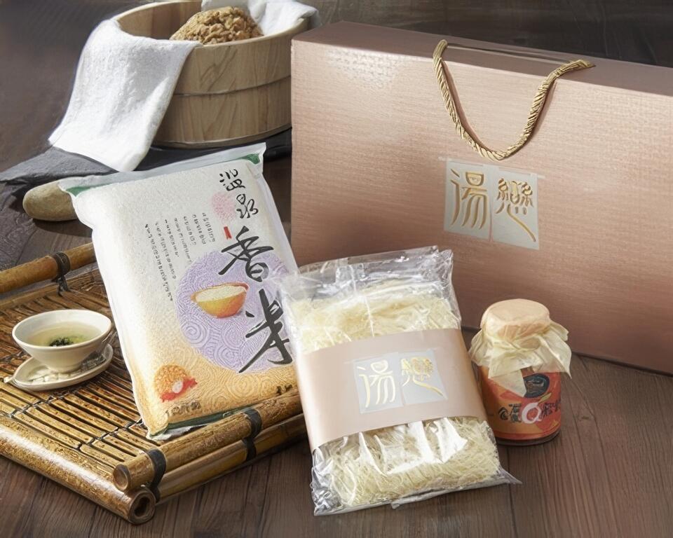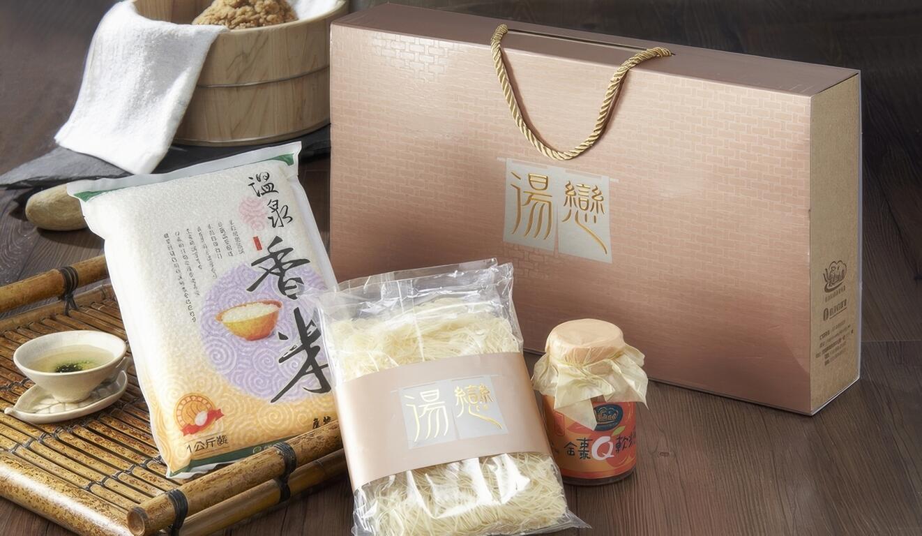 1.溫泉香米2入。2.溫泉米粉3片。3.金棗軟糖1罐
