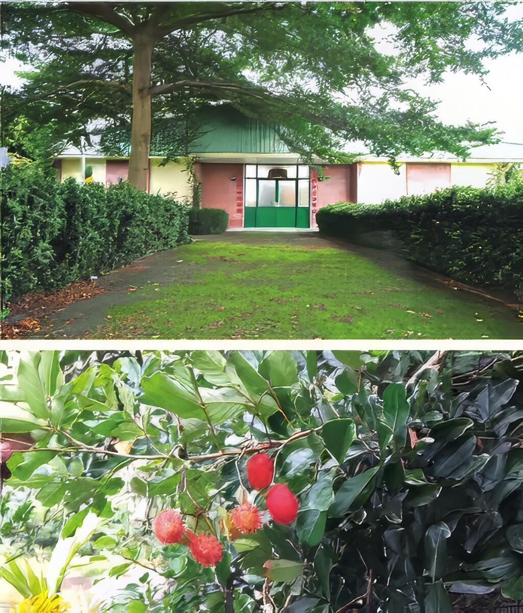 來到大津農場,路口旁映入眼簾的,是一座水果天堂,路兩旁種滿玉荷包,隔絕了塵世擾攘,清新明朗的自色牆壁上, 可以見到陽光篩過樹隙,將酪梨樹的枝葉投影在促進會掛牌 上,與上頭繪畫的綠葉重壘,在虛與實之間增添了幾分趣味。