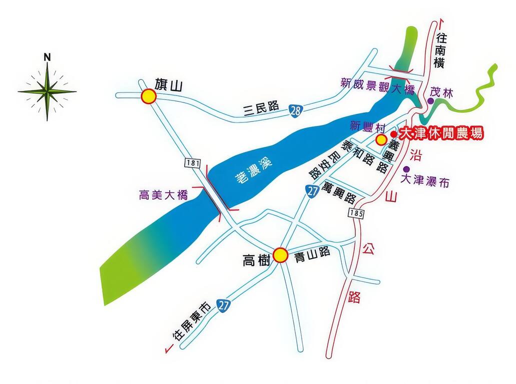 大津農場共 13.5 公頃,種植紅毛丹、玉荷包還有酪梨等作物。農場主人蔡門興說,紅毛丹原產印尼,屬熱帶性水果,因果色鮮豔特殊、果肉甜美,與荔枝口感相似,因而深受歡迎。大津休閒農場所種植的紅毛丹早已回馴化適應屏東氣候,吃紅毛丹不必出國。每年 8 月份產季時,滿樹結實累累,到過廣場的人都視為奇蹟,農場主人 蔡門興早在 30 幾年前就已成功栽種紅毛丹,13 公頃的農場現有上百株的紅毛丹果樹,最久的老株樹齡已 30 幾年。