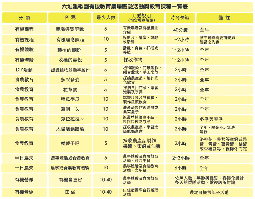 六堆雅歌園有機教育農場, 位於萬巒客家地區,因為對上帝創造的敬畏、對土地環境的愛護、對食品安全的保障,以及對食農教育與環境教育的熱忱,他們致力於推行有機。除生產一般有機蔬果外,還生產極富熱帶特色的蝶豆花、黃金果、紅蔾、洛神及薑黃等,是一個「多彩多滋」的農場。歡迎學校、團體及家庭到訪,認識有機農業、體驗農夫生活、學習烹調料理,並享用客家美食。