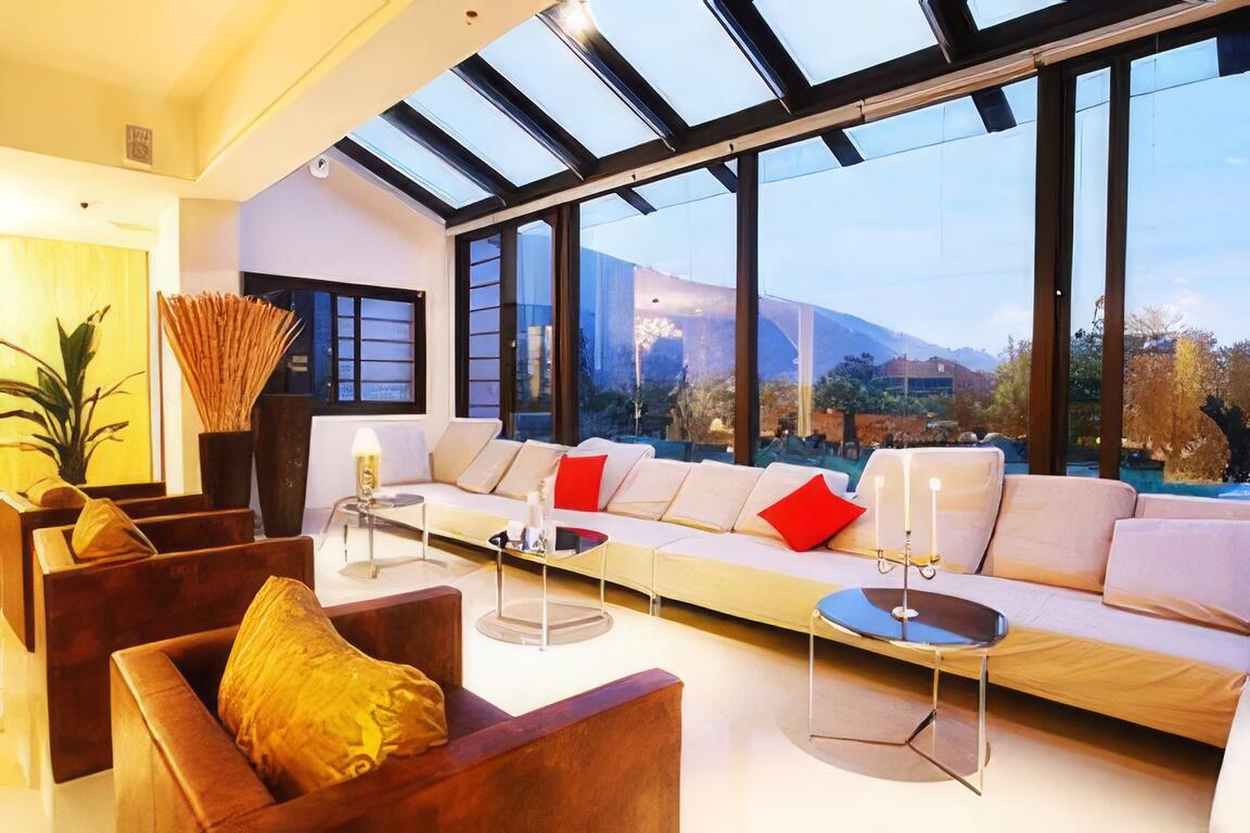 民宿除了擁有絕佳的自然景觀外,勤奮又有眼光的主人,還在園區裡遍植花木,搭配大廳外平台、水池以及大傘蓬雅座特意挑選的黃色遮傘,與戶外的遠山、藍天、花卉搭配下,從大廳窗內望去,視野成了鮮明的對比,也讓景觀更加有色調、更加迷人。