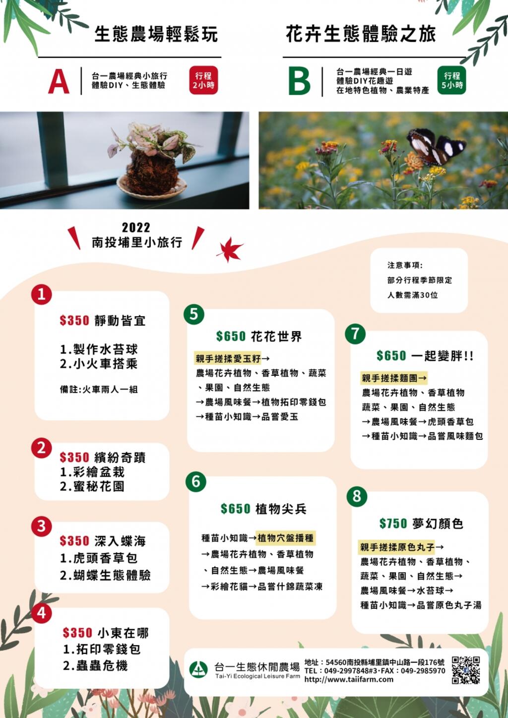 遊客可選擇在象徵愛與幸福的「花神廟」前祈願、觀賞水上鴨群悠遊、隨意漫步在木材與竹建構成的花橋上;或探訪神秘的熱帶雨林區、獨木橋探險,也可以到「蜜蜜花園」尋找女王蜂、參與產蜜、製蜜、品蜜的過程;或逛遊「童話森林」、「綠茵廣場」、「蝶舞館」與體驗花藝DIY等生態行程。遊程中若是飢餓難耐,「台一休閒生態農場」則有以埔里在地食材,結合球根海棠、玫瑰、茉莉等花果鮮蔬製成的季節創意料理,無論視覺、味覺、嗅覺都讓人滿足不已。