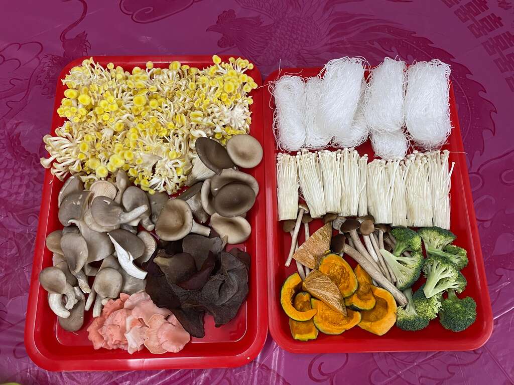 健康養身鍋 (以靈芝茸與巴西蘑菇熬成之湯頭)、酥炸珍菇、鮮炒百菇、木耳牛奶、靈芝茸黑咖啡