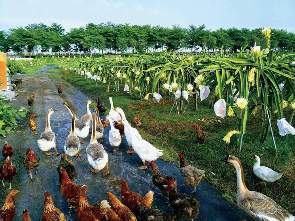 農場主人推廣友善耕種,並在社區大學任教,他的農場內除了檸檬、芭樂,還有撿不完的雞蛋與愛撒嬌的狗兒在腳邊打轉,不時也能看見園中的鴨子偷吃火龍果的趣景。農場中飼養雞、鴨、鵝共生除蟲的方式,不灑農藥、化肥及除草劑之自然農法耕種,讓園區成為一座開心農場。