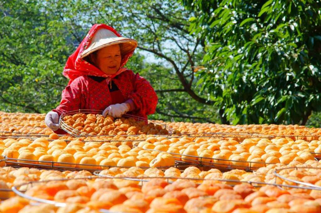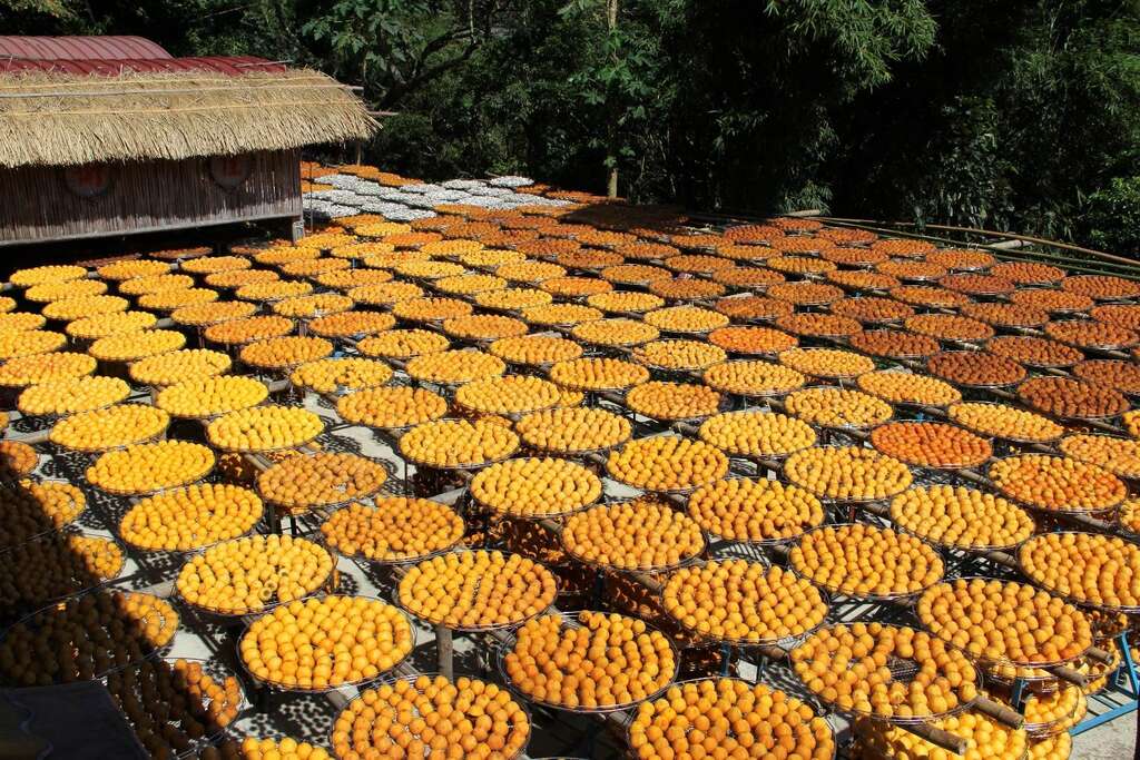 「味衛佳柿餅教育農園」座落於三公頃的山坡地上,從早期的柿農世家,逐步轉型為兼具教育與觀光功能的休閒農場,成為媒體爭相採訪的熱門景點。這裡之所以備受矚目,不僅因為傳統柿餅製作工藝的珍貴,更因為那令人驚艷的曬柿風光——每年九降風起時,後山果園裡兩百餘株柿樹結實纍纍,橙黃柿果掛滿枝頭;而廣場上一個個圓形竹篩承載著金黃柿餅,在陽光照耀下閃爍著琥珀般的光澤,構成一幅令人屏息的秋日詩篇。