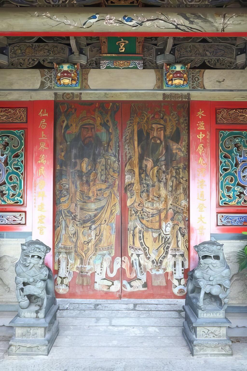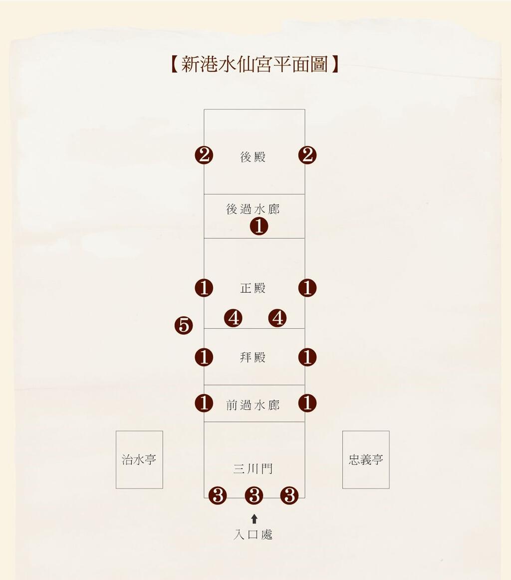 新港水仙宮門神彩繪施作於三川門明間和左右次間共6扇門上,是彩繪大師陳玉峰全臺遺作中保存最為完整的廟門,門神畫面飽滿有生氣、威武中不帶嚴肅,民國98年(公元2009年)還特聘德國壁畫修復大師以復原式古蹟修復法進行修復,是國內首度以國際博物館級方式修復傳統廟門。