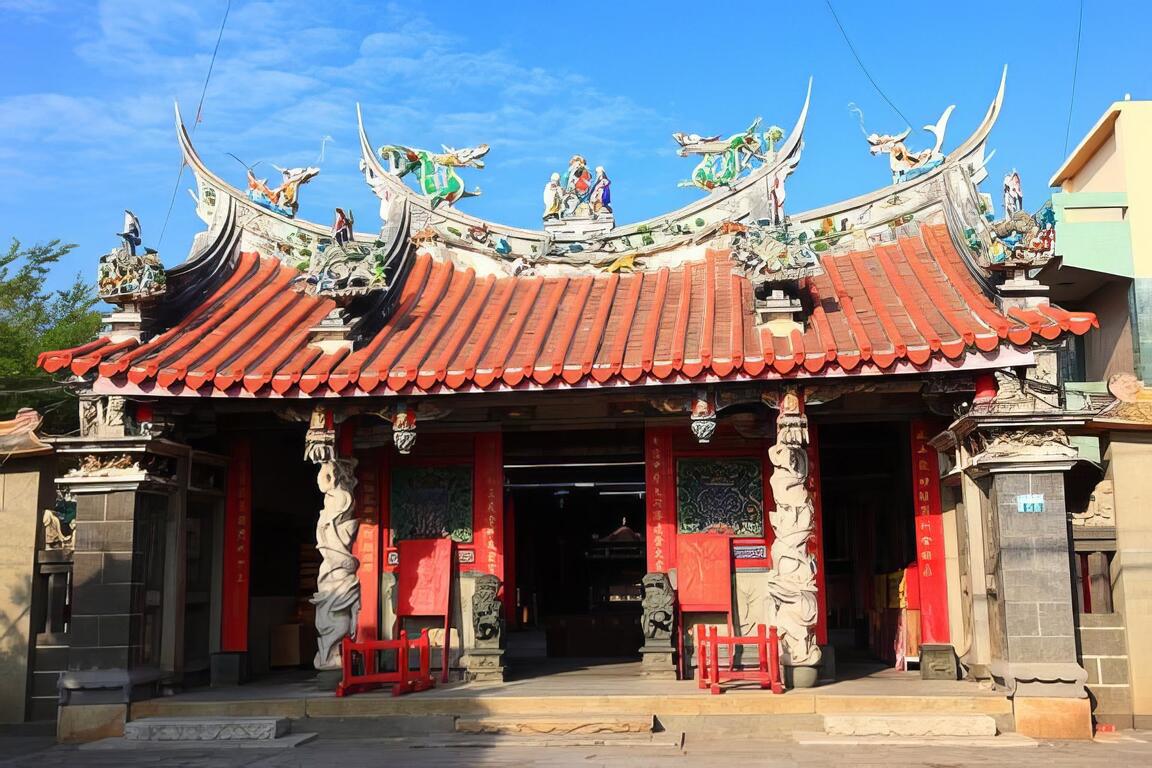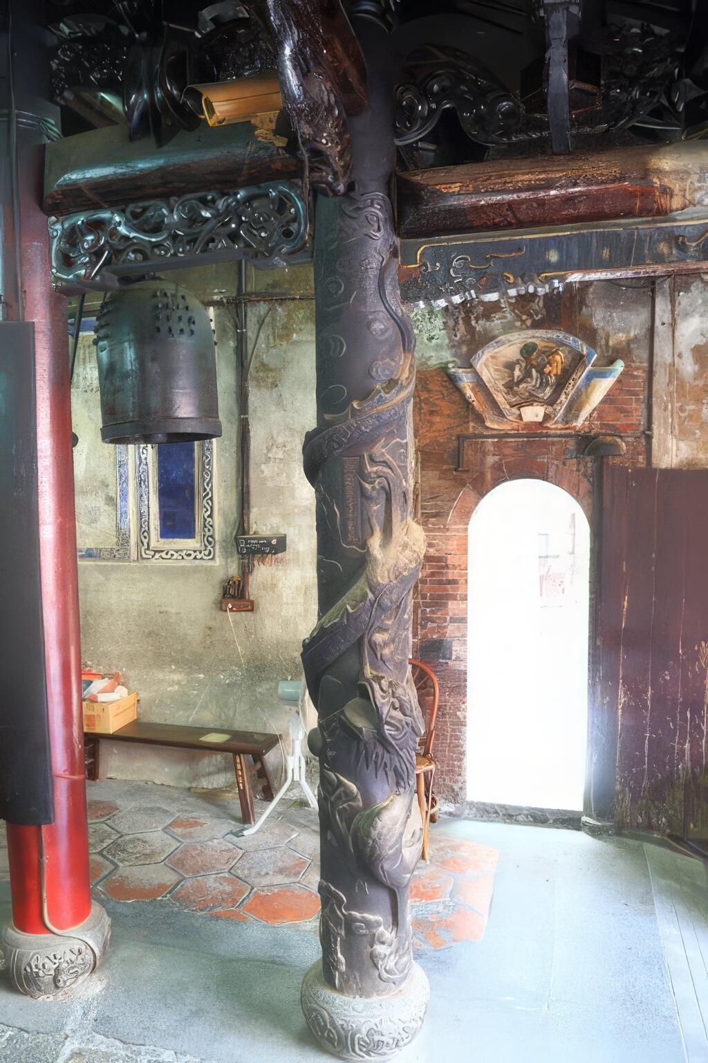 位於正殿前一對蟠龍石柱造型古樸、線條簡潔卻不失渾厚之感,上面落款時間為清乾隆45年(公元1780年),由笨港貢生林開周(生卒年不詳)所捐贈,成為水仙宮建廟落成的重要證物。