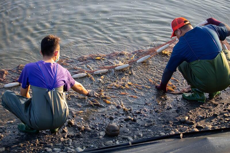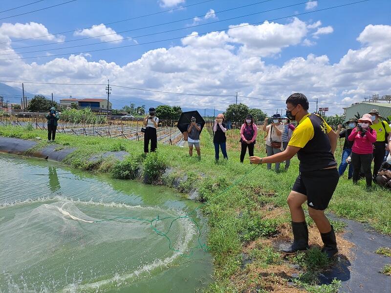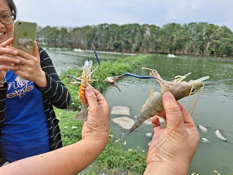 1.生態養殖泰國蝦導覽解說: 餵蝦、使用觀察網觀察蝦子大小