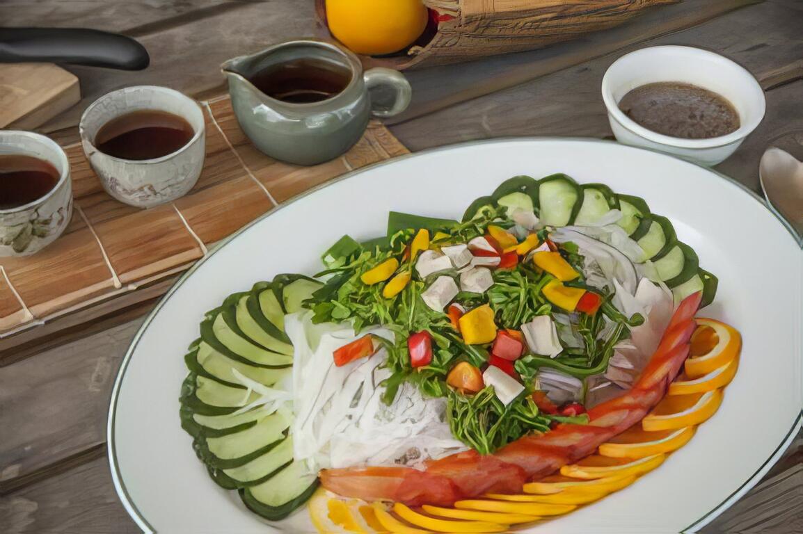 艾草麵線艾草陶盤蝦艾草蔬果大拼盤艾草根雞湯