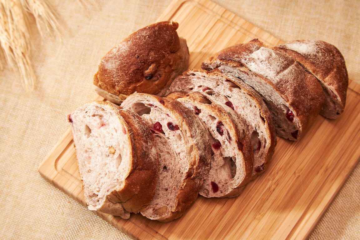 嚴選核桃搭配美國優鮮沛蔓越莓果乾,口感紮實有淡淡的小麥香及果香味。是深受女性顧客喜愛的窯烤麵包。