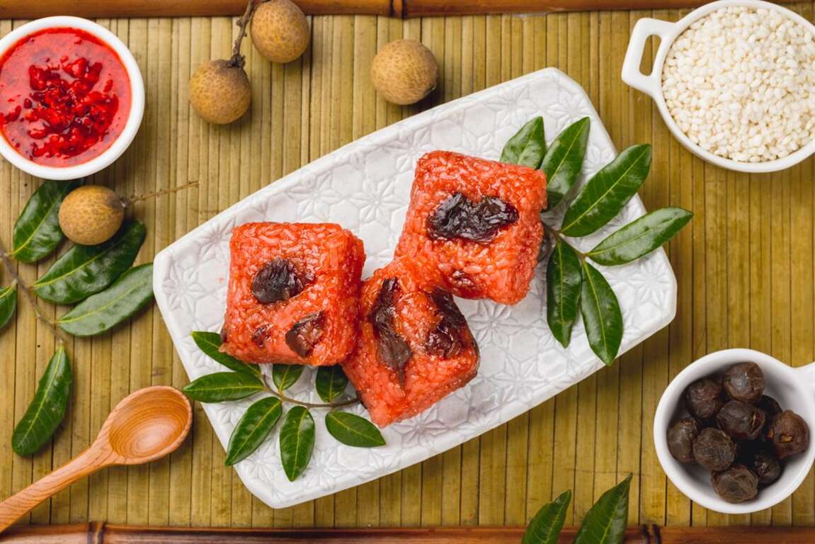純手工做的紅糟桂圓米糕,把龍眼乾、紅麴醬和酒先炒香,最後跟蒸熟的圓糯米拌在一起;糯米 炒出Q度,紅麴有軟化米粒的功用,越嚼越香。