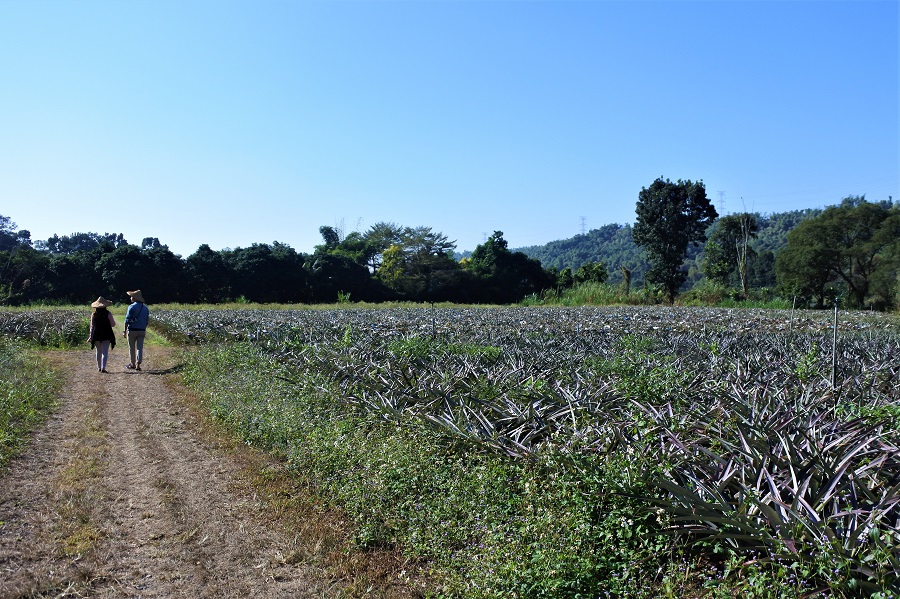 用餐過後,再到公路對面的有機鳳梨田區走走,還在長大中的鳳梨也要防曬,戴上了帽子防止烈日曝曬。與草共生的有機鳳梨沒有施放除草劑,小朋友即使走入田間,讓爸媽也很放心。對鳳梨採摘有興趣的話,也可以上農遊超市網站預訂採鳳梨體驗,深入農田來趟鳳梨的深入探索吧!(更多資訊請參考
