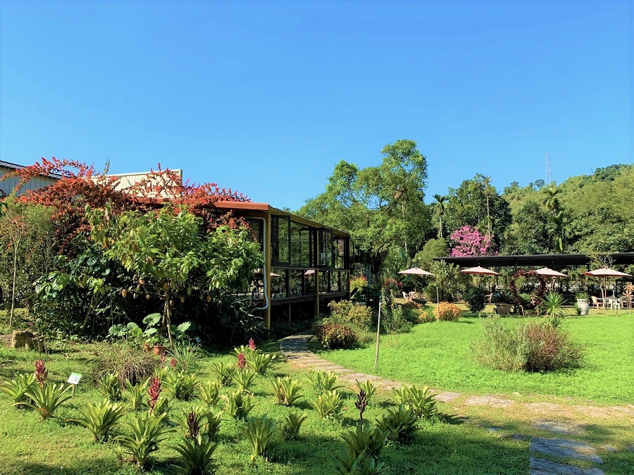 園區裡的園藝造景,都是熱愛花草的謝美蓮和先生親手打理,除了各式鳳梨造景,種植了許多四季更迭綻放的花草,夏天的穗花棋盤腳、冬天的垂枝茉莉、錫葉藤和碩大的鹿角蕨與龜背芋、空氣鳳梨、咖啡樹等等不計其數。冬天最醒目的陽傘花棚架,在冬陽裡綻放耀眼的橘紅,碟型花萼就像迷你小花傘,站在花棚架下感受花團錦簇的幸福感,在農場主人的巧手下,入眼處都是賞心悅目的美景。