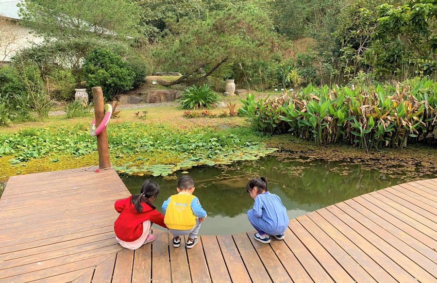 ▲生態池區是台北赤蛙的家,還有各種蜻蜓來點水、睡蓮與水生植物,小朋友來此探險當生態小小研究員,也要注意水深及安全。