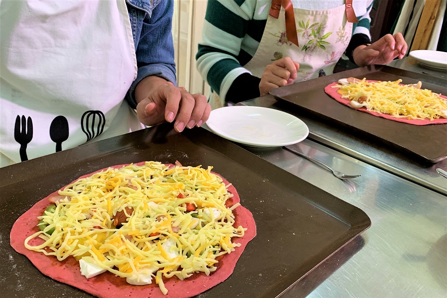 農場細心地幫大家先準備好了材料,鳳「藜」Pizza最特別的地方,就是麵糰加入了自己種植的紅藜,呈現了美麗的玫瑰紅色澤,看起來十分可口,且營養價值特別高。我們跟著小老師的解說,一步步先將柔軟的紅藜餅皮桿平,再依序放上各式食材。絕對不能錯過的就是銘泉自己種的有機鳳梨。剛出爐的Pizza熱騰騰的最好吃,起司拉絲帶入酸甜香的鳳梨,一口接一口,小朋友們一個人就能吃完一整塊。