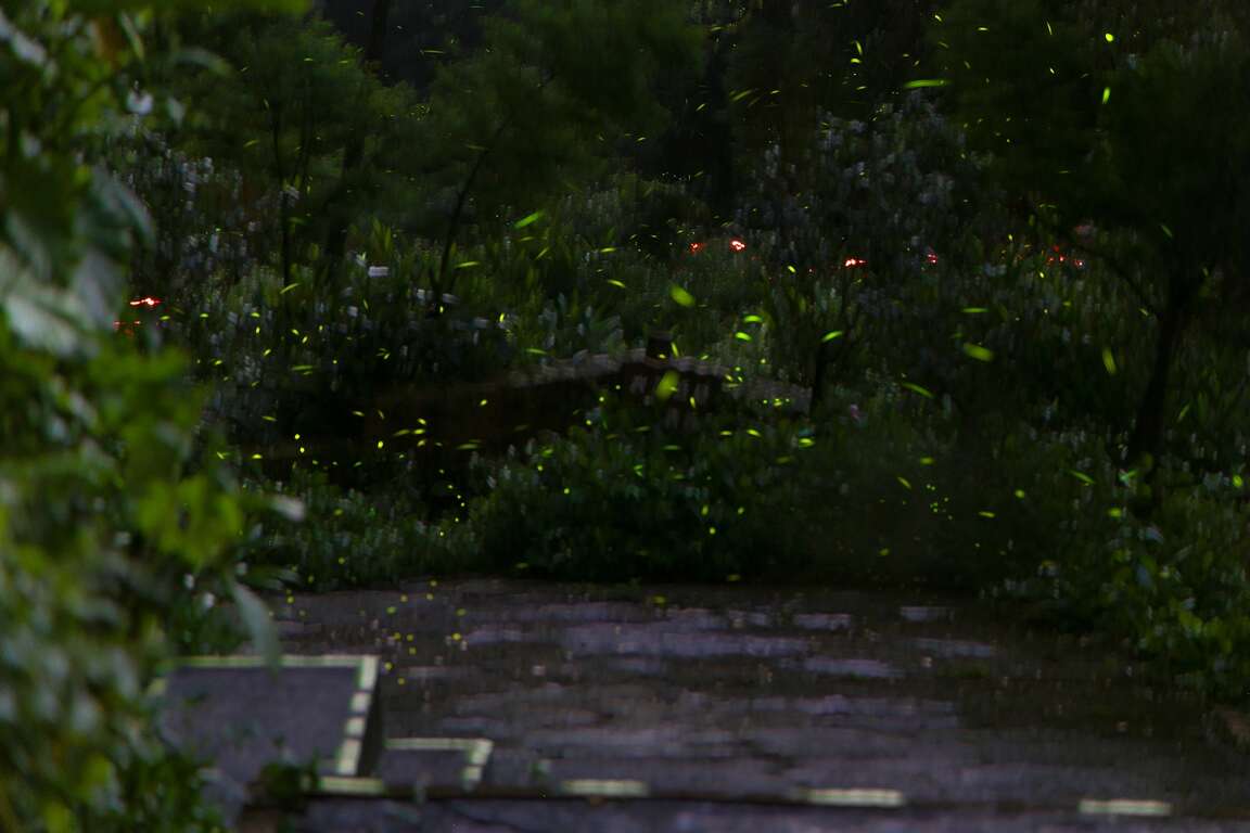 夜幕低垂,整座文山農場皆實施燈火管制,僅在遊客中心門口留下了一盞紅燈籠,讓螢火蟲能夠在最低光害的環境當中,自在飛舞,也在此時,導覽員帶著大家,走出教室深入農場的每條步道,與螢共舞。