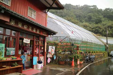 深入採果路段末端,外觀樸實的美麗田農園門前景觀台幽靜,可一覽飛機起降與台北101大樓夜景。這裡以香水草莓、桃薰草莓品種為大宗,且皆以自然農法高架栽種,不噴灑農藥,獲得特色農遊場域認證。